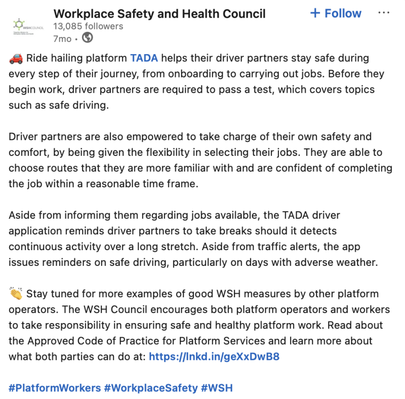 The initiative has been commended by the Workplace Safety and Health Council (WSHC), reflecting growing recognition of TADA’s efforts to champion driver well-being and prevent fatigue-related incidents.